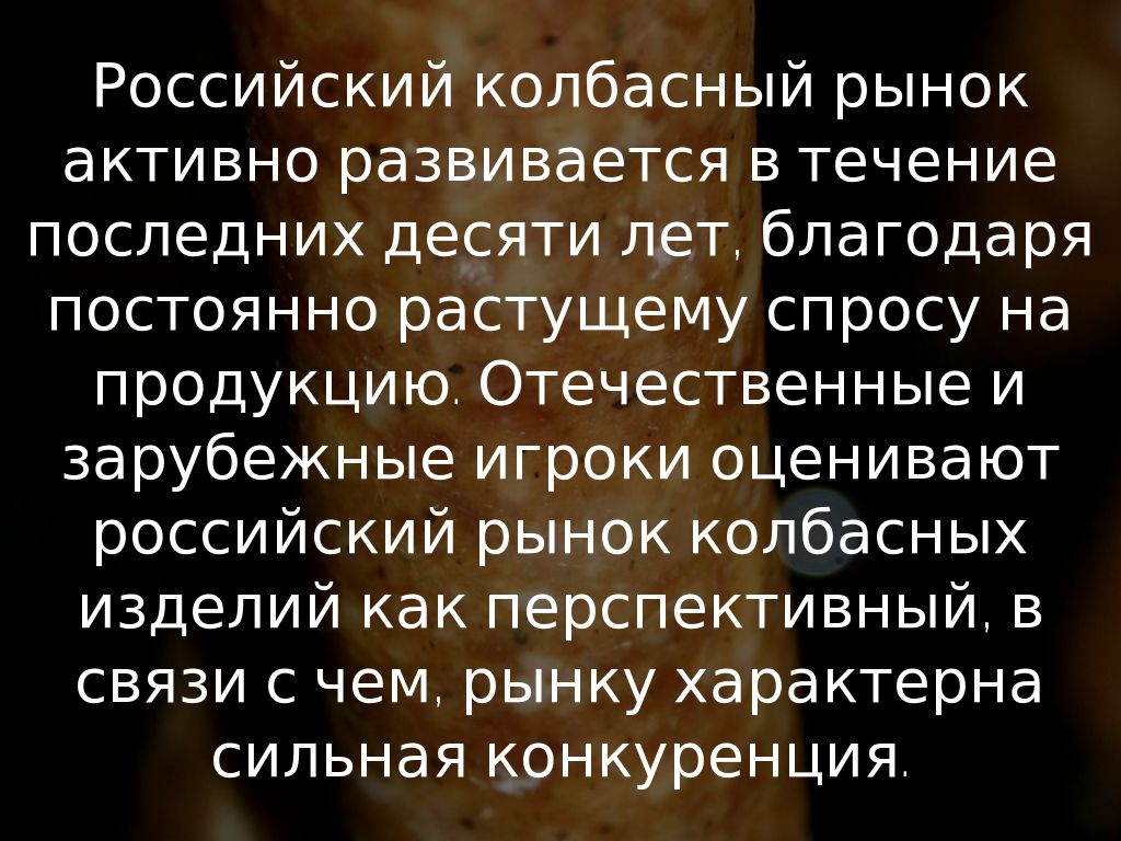 Российский колбасный рынок активно развивается в течение последних десяти лет, благодаря постоянно растущему спросу на продукцию. Отечественные и зарубежные игроки оценивают российский рынок колбасных изделий как перспективный, в связи с чем, рынку характерна сильная конкуренция.