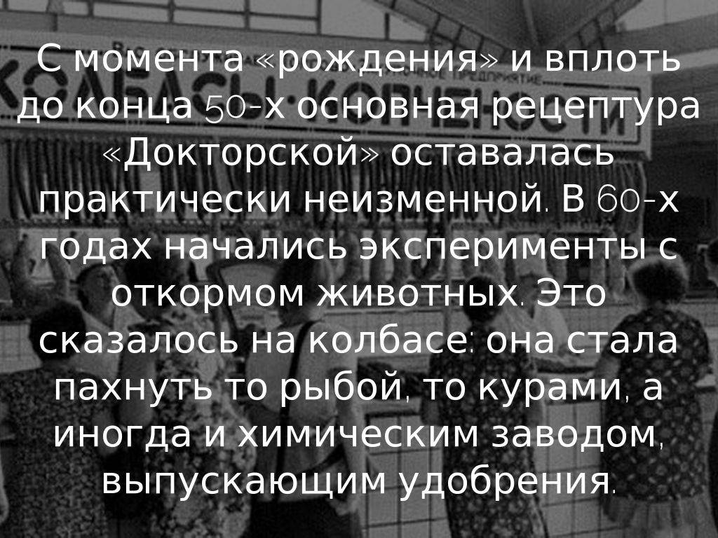С момента «рождения» и вплоть до конца 50-х основная рецептура «Докторской» оставалась практически неизменной. В 60-х годах начались эксперименты с откормом животных. Это сказалось на колбасе: она стала пахнуть то рыбой, то курами, а иногда и химическим заводом, выпускающим удобрения.