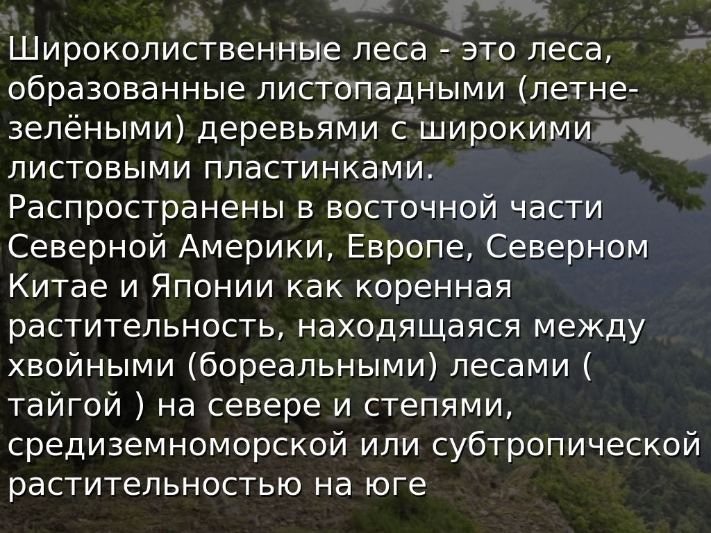 Широколиственные леса - это леса, образованные листопадными (летне-зелёными) деревьями с широкими листовыми пластинками. Распространены в восточной части Северной Америки, Европе, Северном Китае и Японии как коренная растительность, находящаяся между хвойными (бореальными) лесами ( тайгой ) на севере и степями, средиземноморской или субтропической растительностью на юге