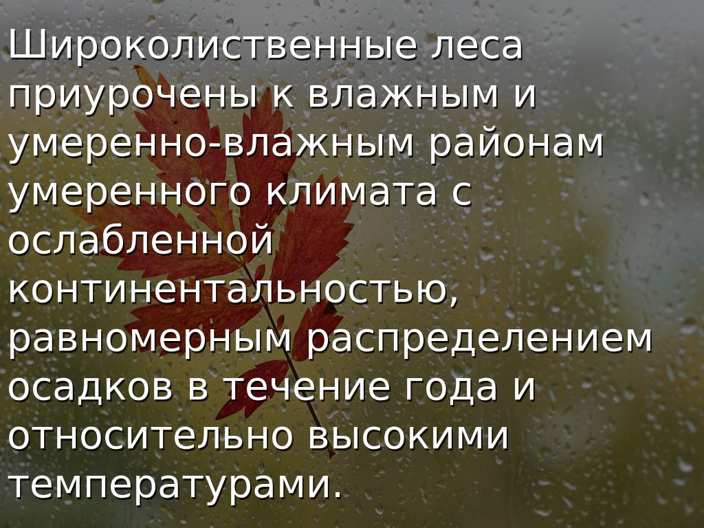 ШИРОКОЛИСТВЕННЫЕ ЛЕСА, ЛЕСА, ОБРАЗОВАННЫЕ ЛИСТОПАДНЫМИ (ЛЕТНЕ-ЗЕЛЁНЫМИ) ДЕРЕВЬЯМИ С ШИРОКИМИ ЛИСТОВЫМИ ПЛАСТИНКАМИ. РАСПРОСТРАНЕНЫ В ВОСТОЧНОЙ ЧАСТИ СЕВЕРНОЙ АМЕРИКИ, ЕВРОПЕ, СЕВЕРНОМ КИТАЕ И ЯПОНИИ КАК КОРЕННАЯ РАСТИТЕЛЬНОСТЬ, НАХОДЯЩАЯСЯ МЕЖДУ ХВОЙНЫМИ (БОРЕАЛЬНЫМИ) ЛЕСАМИ (СМ. ТАЙГА)НА С. И СТЕПЯМИ, СРЕДИЗЕМНОМОРСКОЙ ИЛИ СУБТРОПИЧЕСКОЙ РАСТИТЕЛЬНОСТЬЮ НА Ю. Ш. Л. ПРИУРОЧЕНЫ К ВЛАЖНЫМ И УМЕРЕННО ВЛАЖНЫМ РАЙОНАМ С ОСЛАБЛЕННОЙ КОНТИНЕНТАЛЬНОСТЬЮ, РАВНОМЕРНЫМ РАСПРЕДЕЛЕНИЕМ ОСАДКОВ В ТЕЧЕНИЕ ГОДА И ОТНОСИТЕЛЬНО ВЫСОКИМИ ТЕМПЕРАТУРАМИ. ДЛЯ Ш. Л. ТИПИЧНЫ СЕРЫЕ, ТЁМНО-СЕРЫЕ И БУРЫЕ ЛЕСНЫЕ ПОЧВЫ, РЕЖЕ ЧЕРНОЗЁМЫ. В Ш. Л. ДЕРЕВЬЯ СОСТАВЛЯЮТ 1—2-Й ЯРУСЫ; ПОДЛЕСОК, ОБРАЗОВАННЫЙ КУСТАРНИКАМИ,—3-Й ЯРУС; ТРАВЯНИСТО-КУСТАРНИЧКОВЫЙ ПОКРОВ — 4-Й И 5-Й ЯРУСЫ. В ЕВРОПЕ ПРЕОБЛАДАЮТ БУКОВЫЕ, ДУБОВЫЕ, РЕЖЕ ГРАБОВЫЕ И ЛИПОВЫЕ Ш. Л. ПОМИМО ОСНОВНЫХ ЛЕСООБРАЗОВАТЕЛЕЙ В ЕВРОПЕ ОБЫЧНЫ ЯСЕНЬ, ИЛЬМ, КЛЁН. В СЕВЕРНОЙ АМЕРИКЕ НАИБОЛЕЕ ШИРОКО РАСПРОСТРАНЕНЫ КЛЕНОВО-БУКОВЫЕ, ДУБОВО-ГИКОРОВЫЕ, ДУБОВЫЕ, А В ПРОШЛОМ (ДО УНИЧТОЖЕНИЯ КАШТАНА ПАРАЗИТНЫМ ГРИБОМ ENDOTHIA PARASITICA) — ДУБОВО-КАШТАНОВЫЕ ЛЕСА. ИЗ ДР. ДЕРЕВЬЕВ ЧАСТО ВСТРЕЧАЮТСЯ ТЮЛЬПАННОЕ ДЕРЕВО, ЛИКВИДАМБАР, ЛИПА И ДР. В ПОДЗОНЕ ХВОЙНО-ШИРОКОЛИСТВЕННЫХ ЛЕСОВ ЗНАЧИТЕЛЬНУЮ ЧАСТЬ ДРЕВОСТОЯ СОСТАВЛЯЮТ СОСНЫ, ЕЛИ, ЛИСТВЕННИЦЫ И ДРУГИЕ ХВОЙНЫЕ ПОРОДЫ. ДЛЯ ПОДЛЕСКА Ш. Л. ВОСТОЧНОЙ ЕВРОПЫ ОБЫЧНЫ ЛЕЩИНА, ПОЛЕВОЙ И ТАТАРСКИЙ КЛЁНЫ, ЧЕРЁМУХА, БЕРЕСКЛЕТЫ. В ТРАВЯНОМ ПОКРОВЕ Ш. Л. ГОСПОДСТВУЮТ МЕЗОФИЛЬНЫЕ ЭВТРОФНЫЕ ИЛИ МЕЗОТРОФНЫЕ ВИДЫ, В ЕВРОПЕЙСКИХ ЛЕСАХ — ПРОЛЕСНИК, СНЫТЬ, ЗЕЛЕНЧУК, КОПЫТЕНЬ, МЕДУНИЦА, ЯСМЕННИК, ОСОКА ВОЛОСИСТАЯ И ДР. Ш. Л. СВОЙСТВЕННЫ ВЕСЕННИЕ ЭФЕМЕРОИДЫ-ГЕОФИТЫ: ВИДЫ РОДА ХОХЛАТКА, ВЕТРЕНИЦА, ЗУБЯНКА, ПОДСНЕЖНИК, ПРОЛЕСКА, ГУСИНЫЙ ЛУК И ДР., КОТОРЫЕ УСПЕВАЮТ ПРОЙТИ ЦИКЛ РАЗВИТИЯ (ОТ РАСПУСКАНИЯ ЛИСТЬЕВ ДО СОЗРЕВАНИЯ СЕМЯН) ВЕСНОЙ, ДО РАЗВЁРТЫВАНИЯ ЛИСТОВЫХ ДЕРЕВЬЕВ. К АНАЛОГИЧНЫМ Ш. Л. В ЮЖНОМ ПОЛУШАРИИ МОЖНО ПРИЧИСЛИТЬ ЛЕСА ИЗ ЮЖНОГО БУКА (NOTHOFAGUS