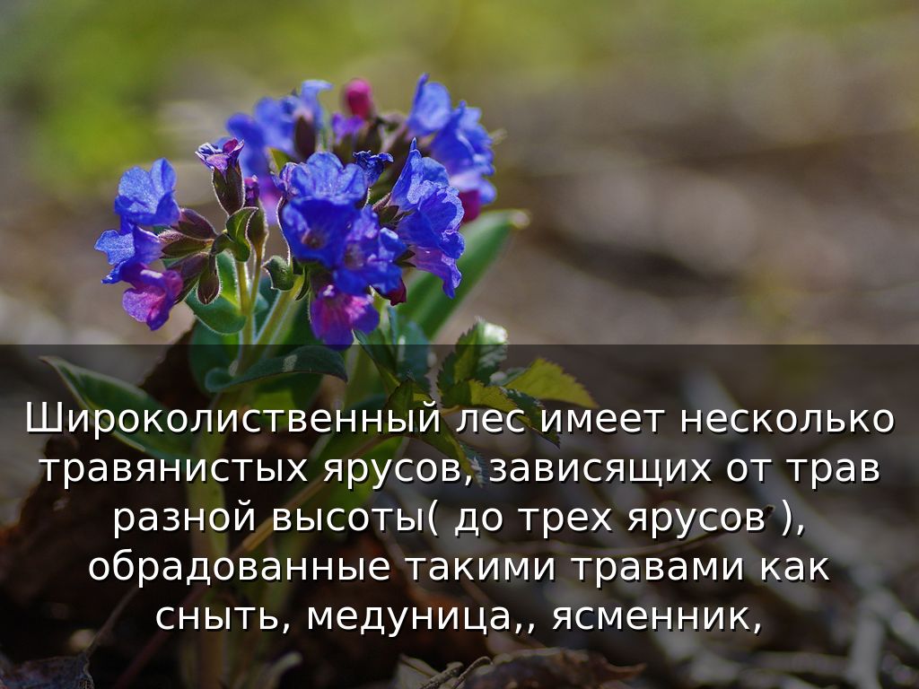 Широколиственный лес имеет несколько травянистых ярусов, зависящих от трав разной высоты( до трех ярусов ), обрадованные такими травами как сныть, медуница,, ясменник,