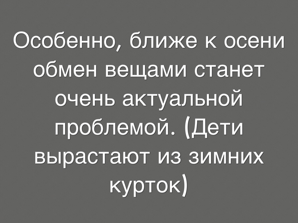 Особенно, ближе к осени обмен вещами станет очень актуальной проблемой. (Дети вырастают из зимних курток)