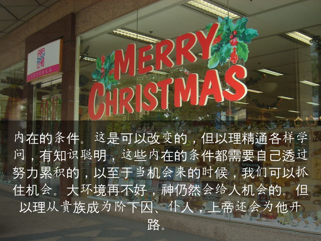 内在的条件。这是可以改变的,但以理精通各样学问,有知识聪明,这些内在的条件都需要自己透过努力累积的,以至于当机会来的时候,我们可以抓住机会。大环境再不好,神仍然会给人机会的。但以理从贵族成为阶下囚、仆人,上帝还会为他开路。