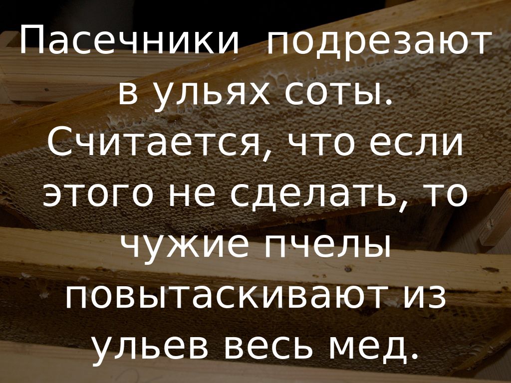 Пасечники подрезают в ульях соты. Считается, что если этого не сделать, то чужие пчелы повытаскивают из ульев весь мед.
