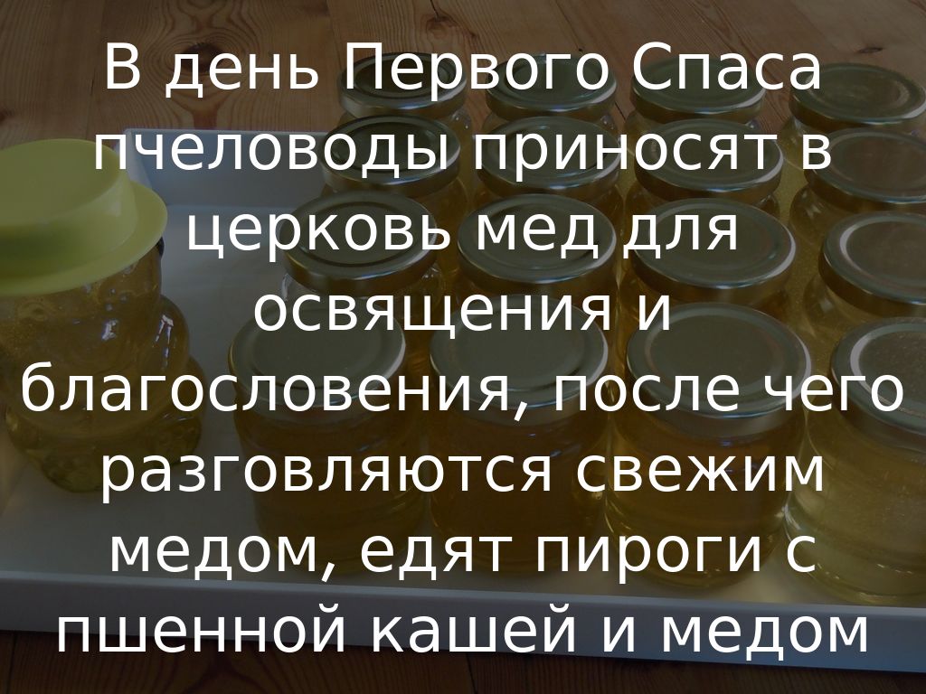 В день Первого Спаса пчеловоды приносят в церковь мед для освящения и благословения, после чего разговляются свежим медом, едят пироги с пшенной кашей и медом