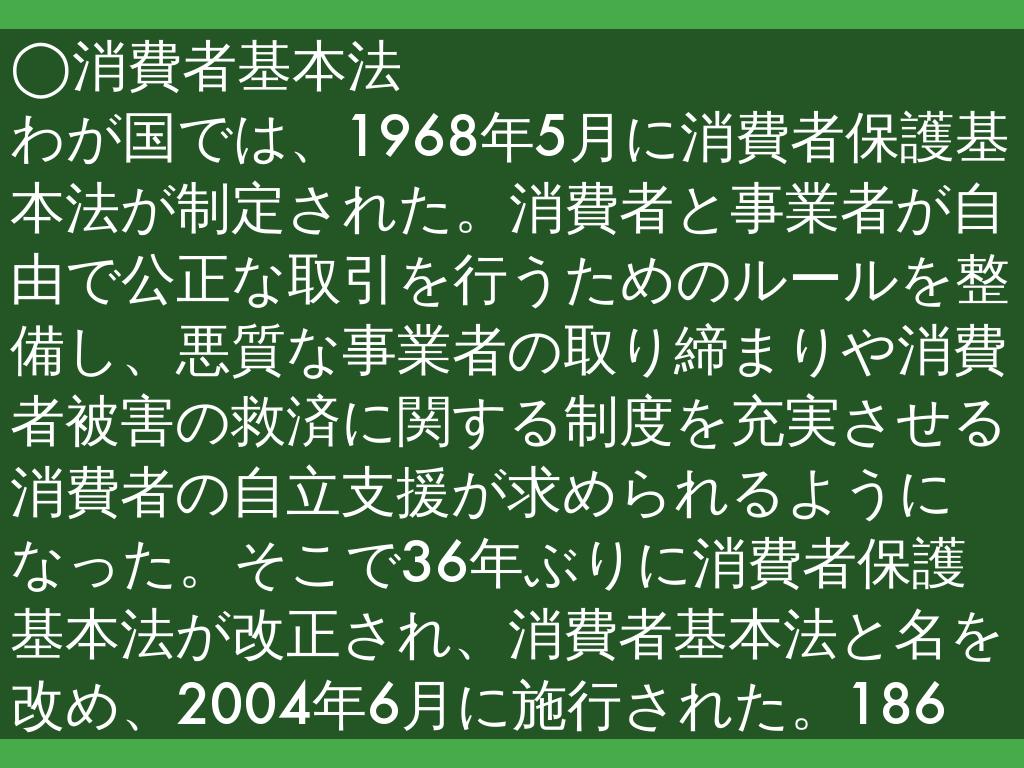 わが国では、1968年5月に消費者保護基本法が制定された。消費者と事業者が自由で公正な取引を行うためのルールを整備し、悪質な事業者の取り締まりや消費者被害の救済に関する制度を充実させる消費者の自立支援が求められるようになった。そこで36年ぶりに消費者保護基本法が改正され、消費者基本法と名を改め、2004年6月に施行された。186