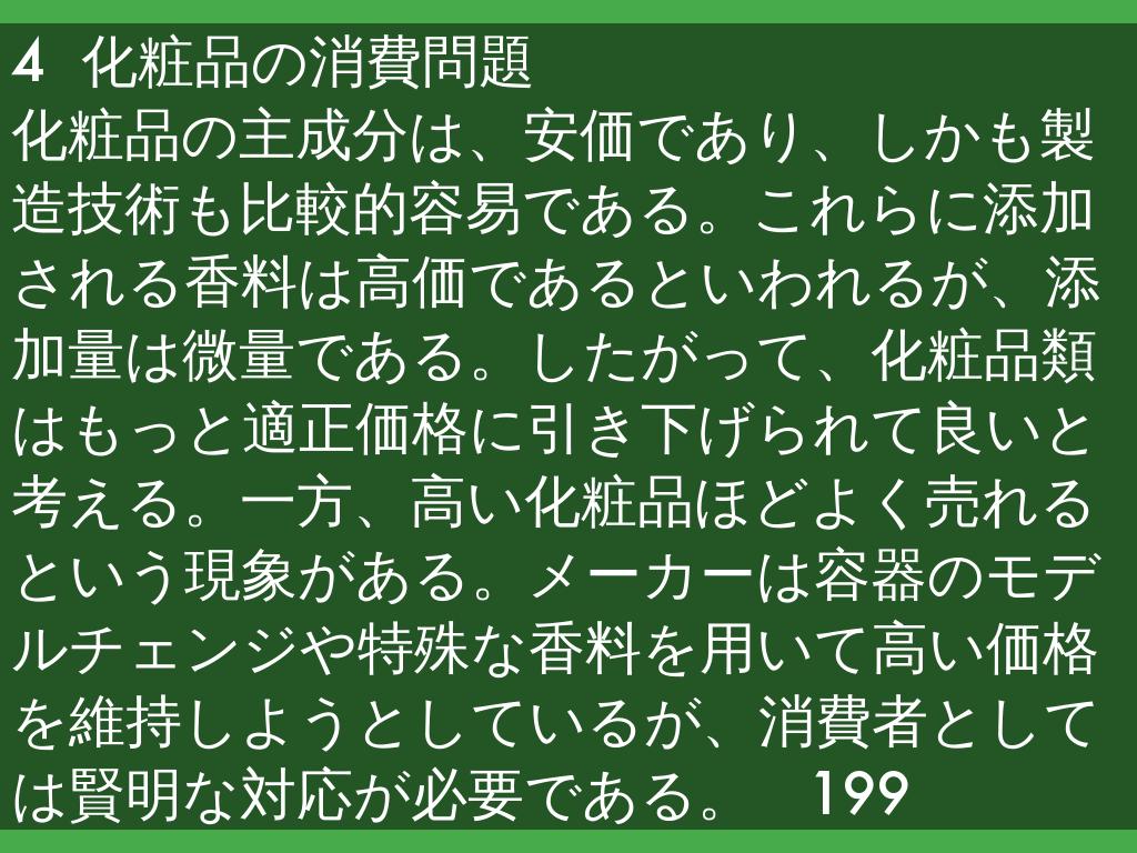 化粧品の主成分は、安価であり、しかも製造技術も比較的容易である。これらに添加される香料は高価であるといわれるが、添加量は微量である。したがって、化粧品類はもっと適正価格に引き下げられて良いと考える。一方、高い化粧品ほどよく売れるという現象がある。メーカーは容器のモデルチェンジや特殊な香料を用いて高い価格を維持しようとしているが、消費者としては賢明な対応が必要である。 199