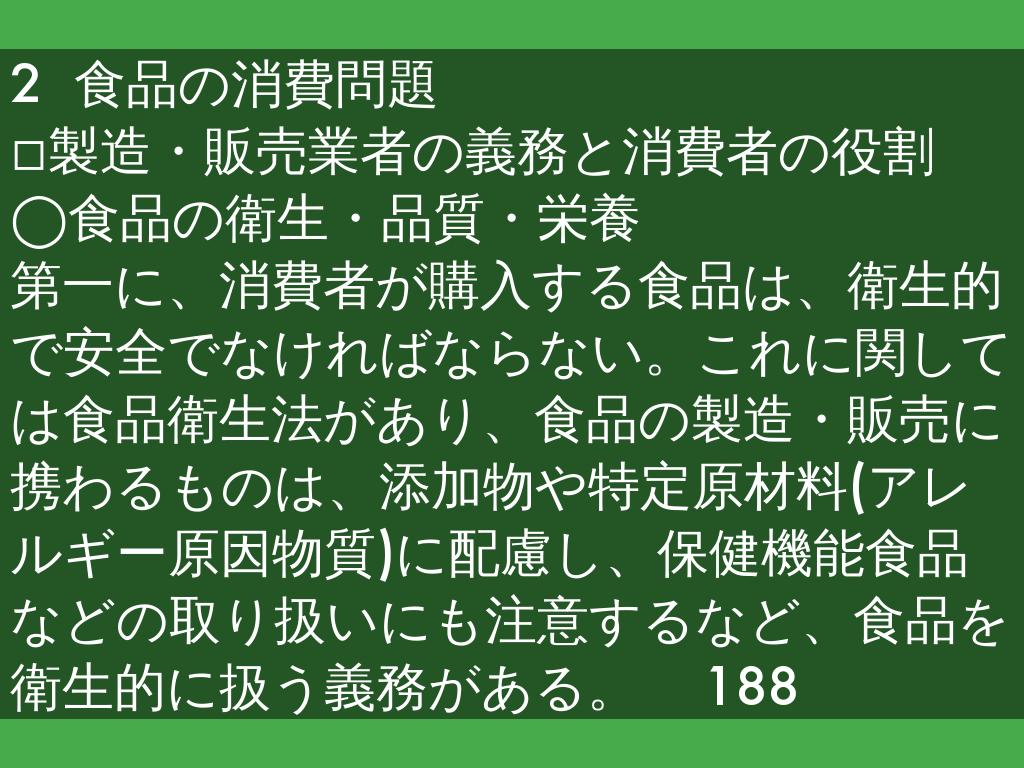 第一に、消費者が購入する食品は、衛生的で安全でなければならない。これに関しては食品衛生法があり、食品の製造・販売に携わるものは、添加物や特定原材料(アレルギー原因物質)に配慮し、保健機能食品などの取り扱いにも注意するなど、食品を衛生的に扱う義務がある。 188