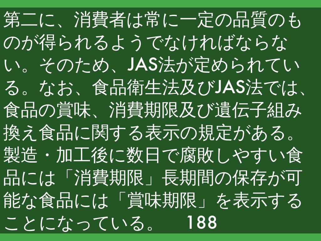 第二に、消費者は常に一定の品質のものが得られるようでなければならない。そのため、JAS法が定められている。なお、食品衛生法及びJAS法では、食品の賞味、消費期限及び遺伝子組み換え食品に関する表示の規定がある。製造・加工後に数日で腐敗しやすい食品には「消費期限」長期間の保存が可能な食品には「賞味期限」を表示することになっている。 188