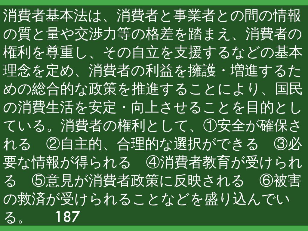 消費者基本法は、消費者と事業者との間の情報の質と量や交渉力等の格差を踏まえ、消費者の権利を尊重し、その自立を支援するなどの基本理念を定め、消費者の利益を擁護・増進するための総合的な政策を推進することにより、国民の消費生活を安定・向上させることを目的としている。消費者の権利として、①安全が確保される ②自主的、合理的な選択ができる ③必要な情報が得られる ④消費者教育が受けられる ⑤意見が消費者政策に反映される ⑥被害の救済が受けられることなどを盛り込んでいる。 187