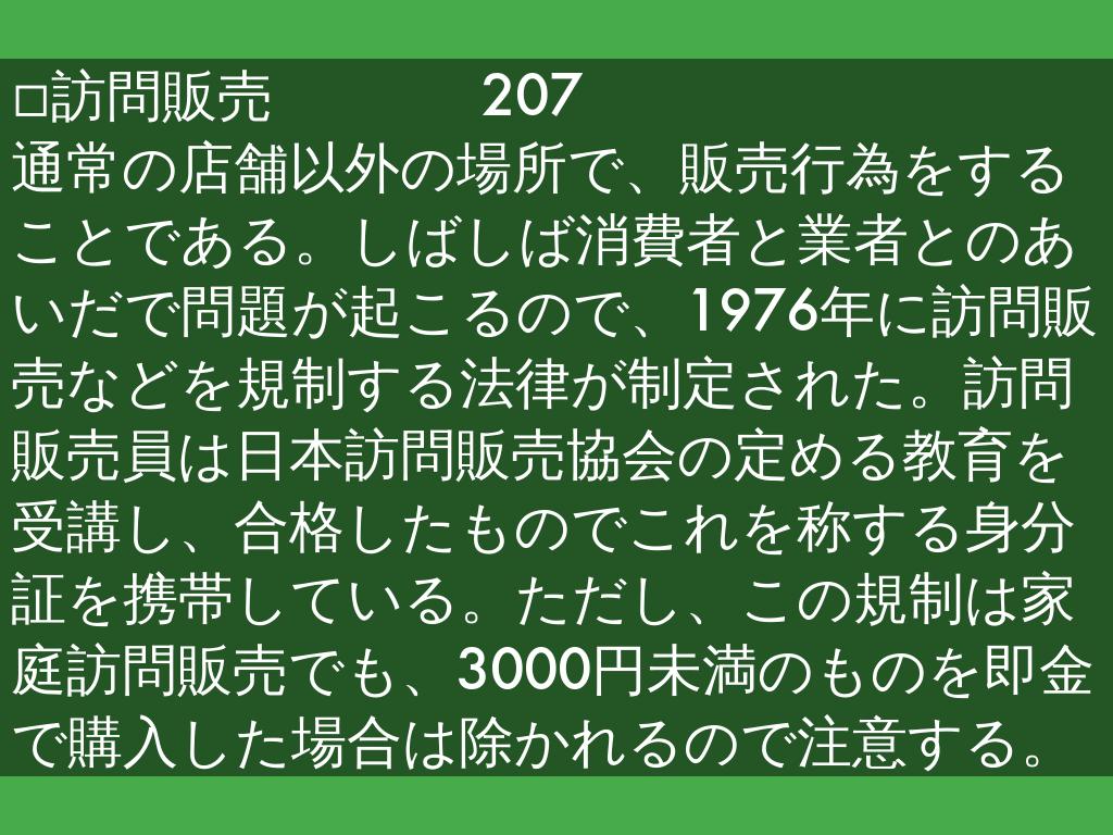 通常の店舗以外の場所で、販売行為をすることである。しばしば消費者と業者とのあいだで問題が起こるので、1976年に訪問販売などを規制する法律が制定された。訪問販売員は日本訪問販売協会の定める教育を受講し、合格したものでこれを称する身分証を携帯している。ただし、この規制は家庭訪問販売でも、3000円未満のものを即金で購入した場合は除かれるので注意する。