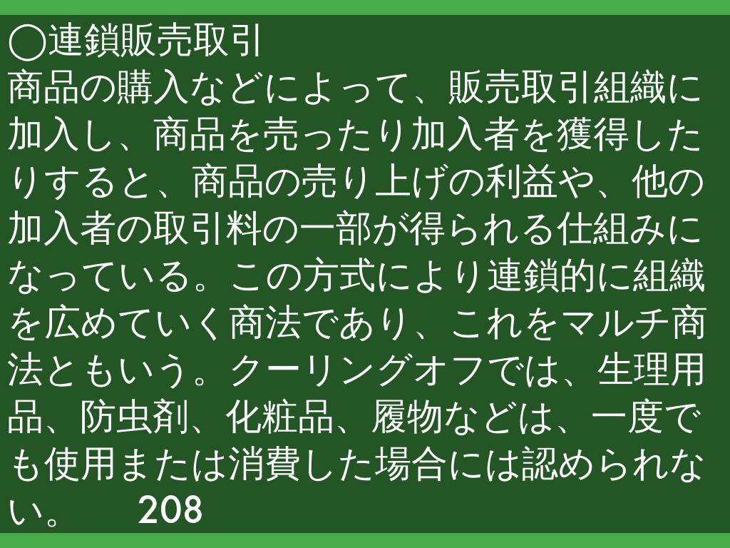 商品の購入などによって、販売取引組織に加入し、商品を売ったり加入者を獲得したりすると、商品の売り上げの利益や、他の加入者の取引料の一部が得られる仕組みになっている。この方式により連鎖的に組織を広めていく商法であり、これをマルチ商法ともいう。クーリングオフでは、生理用品、防虫剤、化粧品、履物などは、一度でも使用または消費した場合には認められない。 208