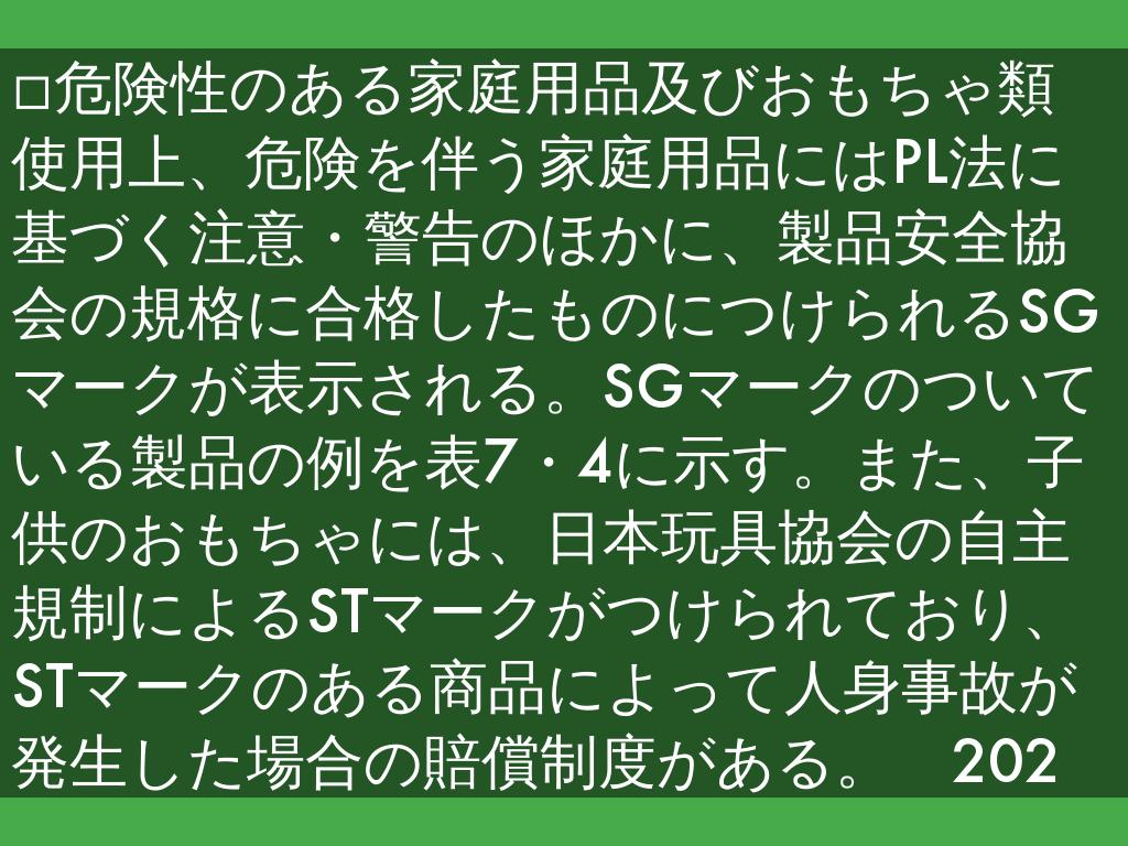使用上、危険を伴う家庭用品にはPL法に基づく注意・警告のほかに、製品安全協会の規格に合格したものにつけられるSGマークが表示される。SGマークのついている製品の例を表7・4に示す。また、子供のおもちゃには、日本玩具協会の自主規制によるSTマークがつけられており、STマークのある商品によって人身事故が発生した場合の賠償制度がある。 202