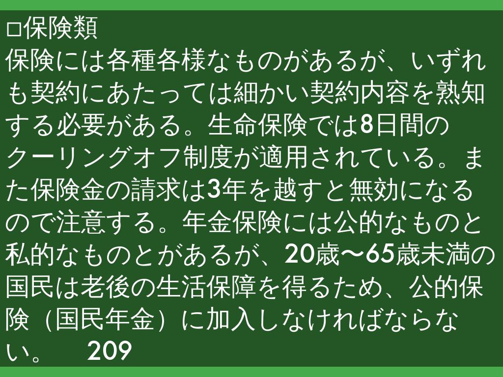 保険には各種各様なものがあるが、いずれも契約にあたっては細かい契約内容を熟知する必要がある。生命保険では8日間のクーリングオフ制度が適用されている。また保険金の請求は3年を越すと無効になるので注意する。年金保険には公的なものと私的なものとがあるが、20歳〜65歳未満の国民は老後の生活保障を得るため、公的保険(国民年金)に加入しなければならない。 209