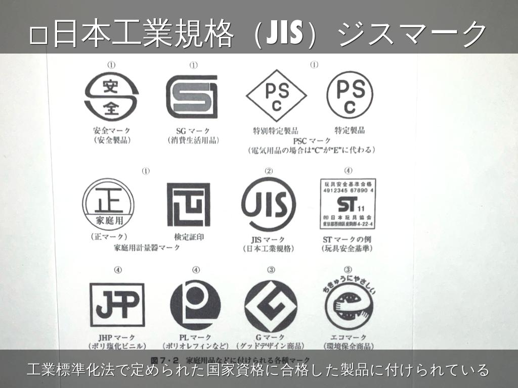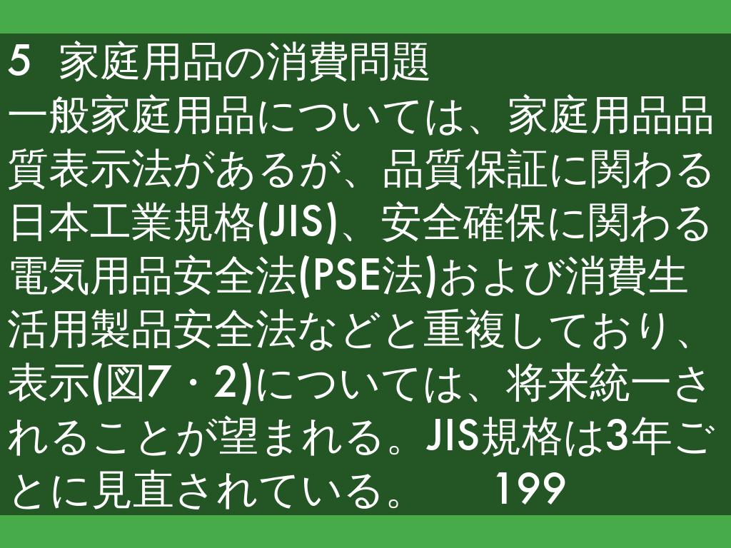一般家庭用品については、家庭用品品質表示法があるが、品質保証に関わる日本工業規格(JIS)、安全確保に関わる電気用品安全法(PSE法)および消費生活用製品安全法などと重複しており、表示(図7・2)については、将来統一されることが望まれる。JIS規格は3年ごとに見直されている。 199