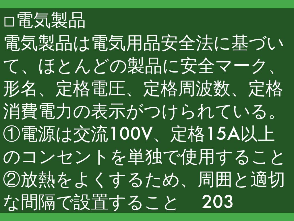 電気製品は電気用品安全法に基づいて、ほとんどの製品に安全マーク、形名、定格電圧、定格周波数、定格消費電力の表示がつけられている。