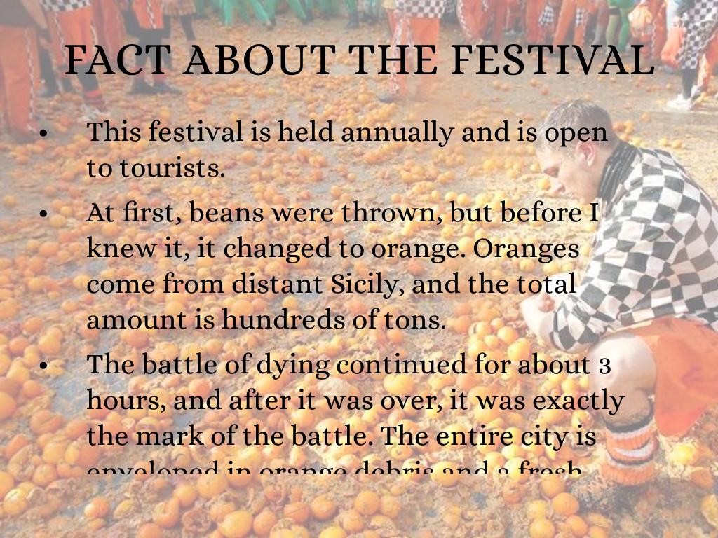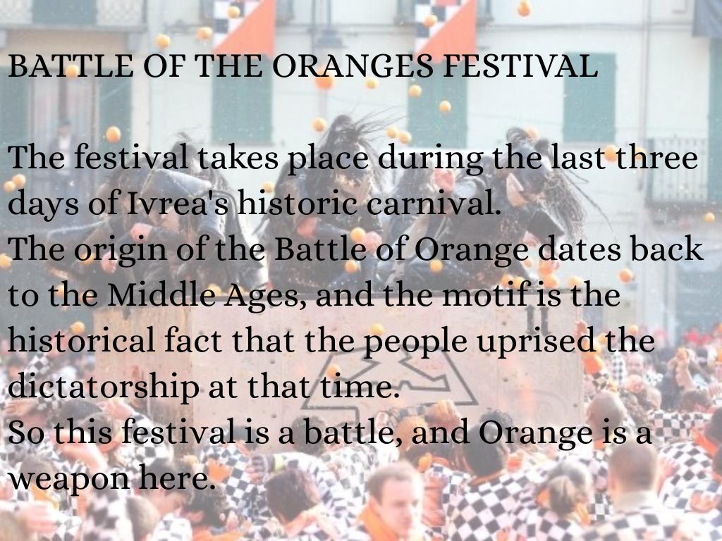 The festival takes place during the last three days of Ivrea's historic carnival.