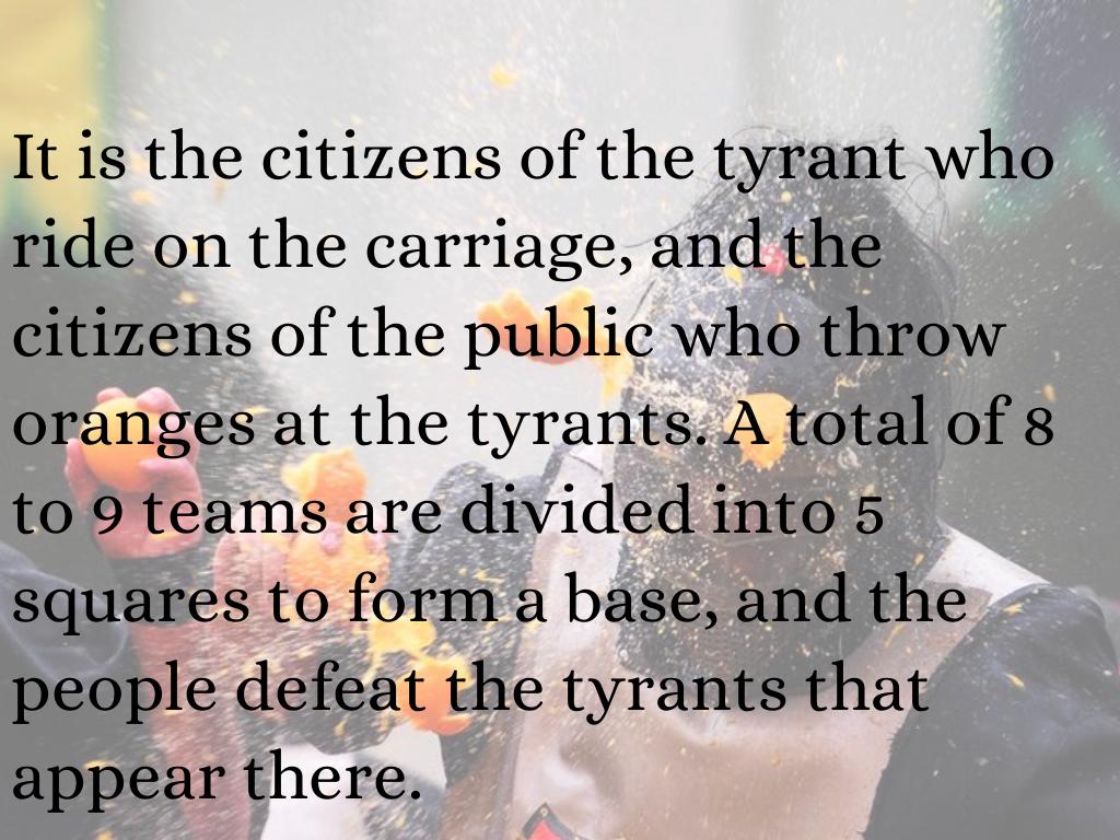 It is the citizens of the tyrant who ride on the carriage, and the citizens of the public who throw oranges at the tyrants. A total of 8 to 9 teams are divided into 5 squares to form a base, and the people defeat the tyrants that appear there.