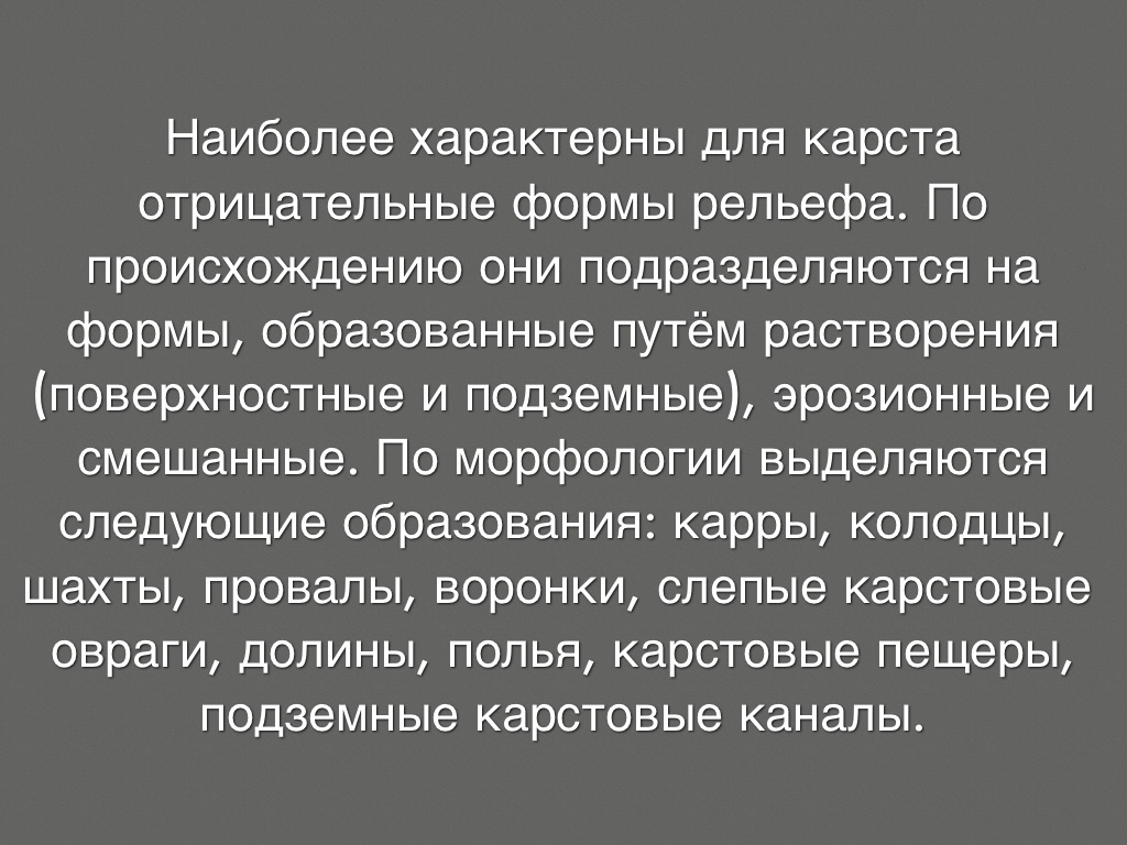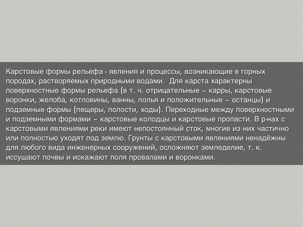 Карстовые формы рельефа - явления и процессы, возникающие в горных породах, растворяемых природными водами. Для карста характерны поверхностные формы рельефа (в т. ч. отрицательные – карры, карстовые воронки, желоба, котловины, ванны, полья и положительные – останцы) и подземные формы (пещеры, полости, ходы). Переходные между поверхностными и подземными формами – карстовые колодцы и карстовые пропасти. В р-нах с карстовыми явлениями реки имеют непостоянный сток, многие из них частично или полностью уходят под землю. Грунты с карстовыми явлениями ненадёжны для любого вида инженерных сооружений, осложняют земледелие, т. к. иссушают почвы и искажают поля провалами и воронками.
