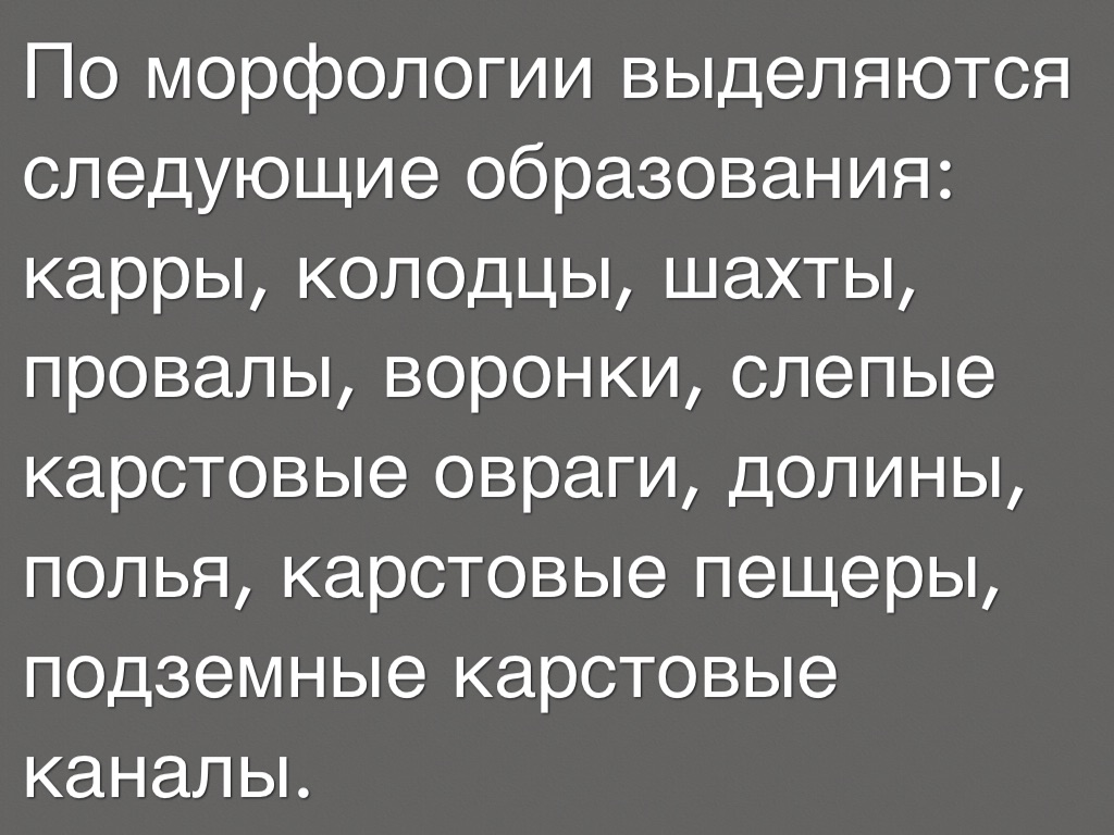 По морфологии выделяются следующие образования: карры, колодцы, шахты, провалы, воронки, слепые карстовые овраги, долины, полья, карстовые пещеры, подземные карстовые каналы.