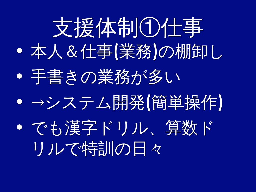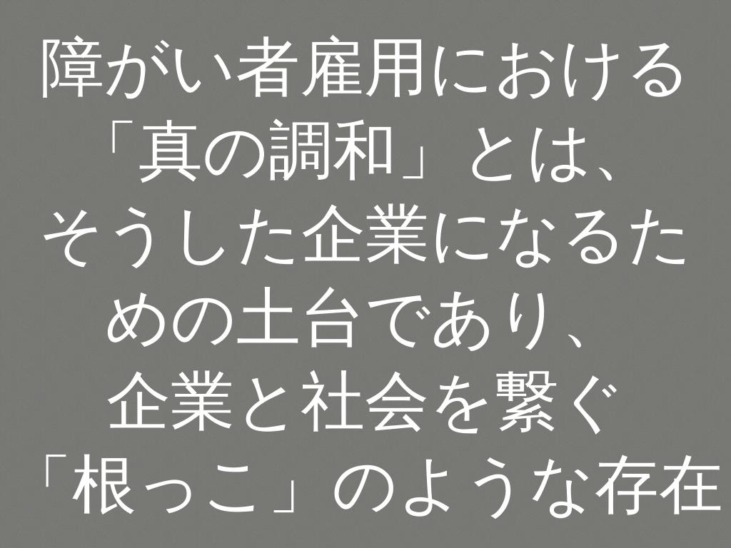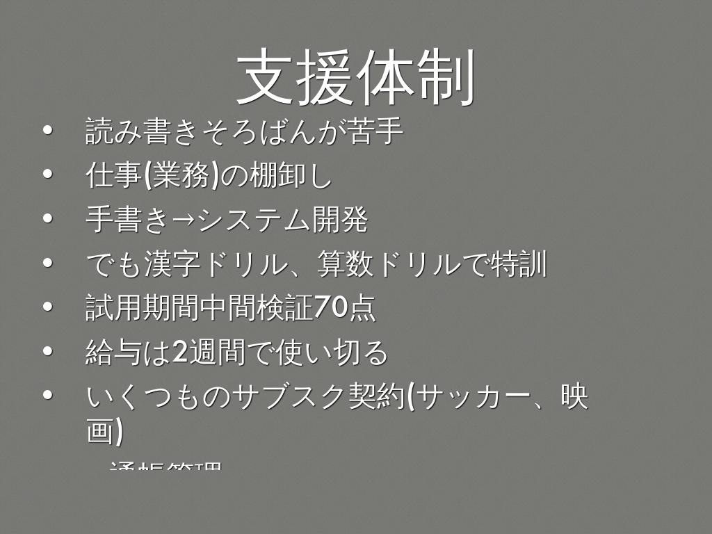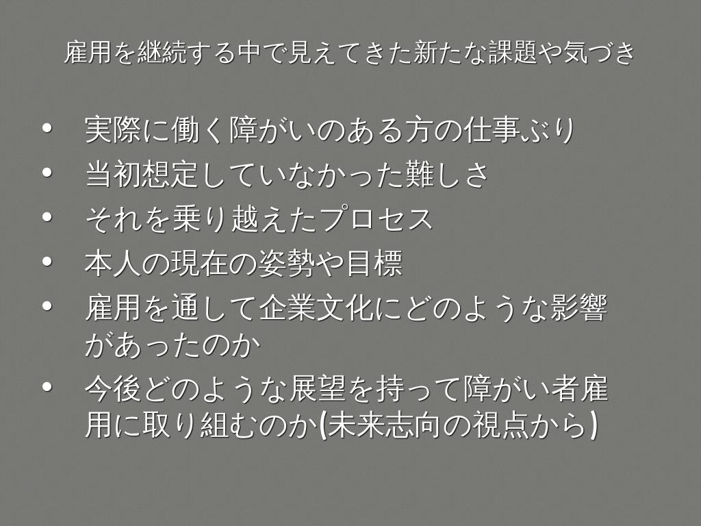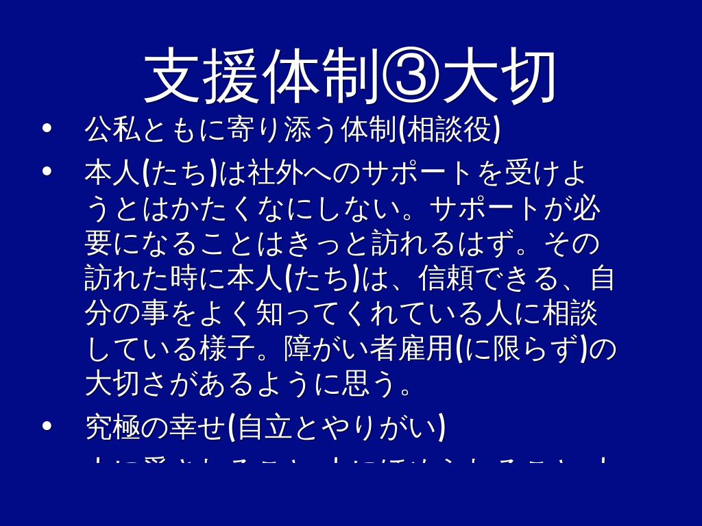- 本人(たち)は社外へのサポートを受けようとはかたくなにしない。サポートが必要になることはきっと訪れるはず。その訪れた時に本人(たち)は、信頼できる、自分の事をよく知ってくれている人に相談しているよう。障がい者雇用(に限らず)の大切さがあるように思う。