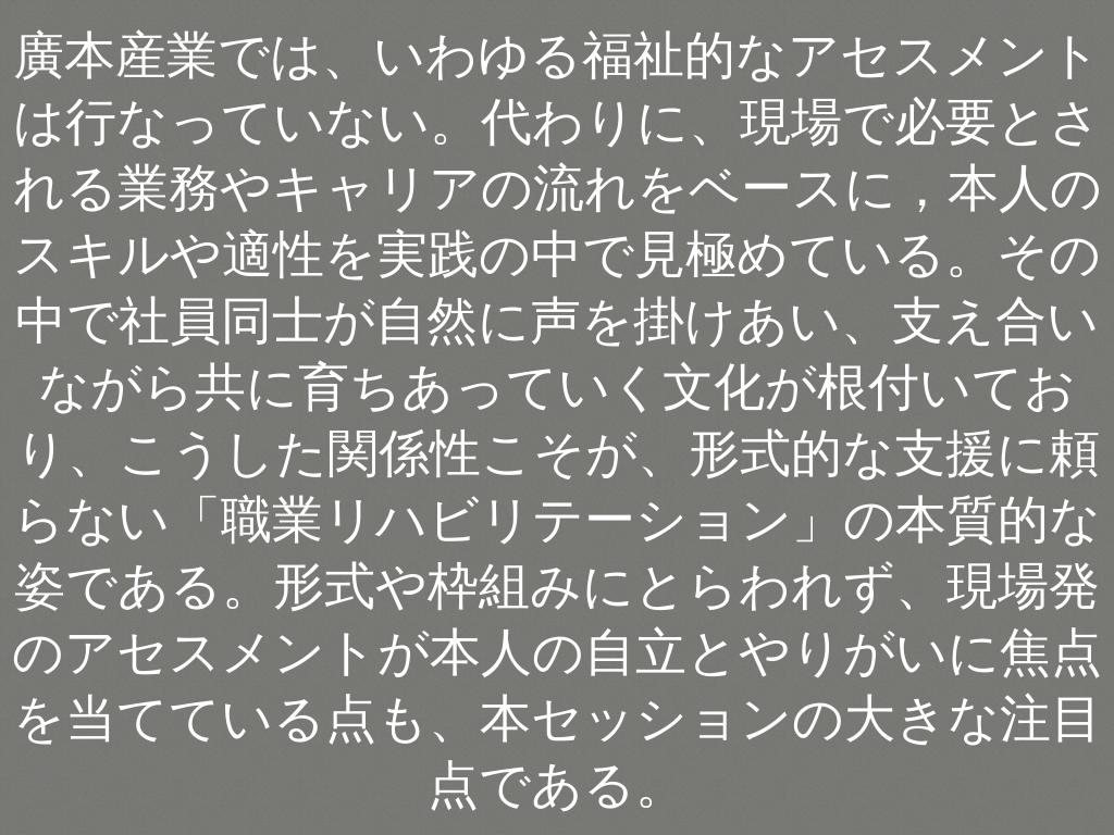廣本産業では、いわゆる福祉的なアセスメントは行なっていない。代わりに、現場で必要とされる業務やキャリアの流れをベースに,本人のスキルや適性を実践の中で見極めている。その中で社員同士が自然に声を掛けあい、支え合いながら共に育ちあっていく文化が根付いており、こうした関係性こそが、形式的な支援に頼らない「職業リハビリテーション」の本質的な姿である。形式や枠組みにとらわれず、現場発のアセスメントが本人の自立とやりがいに焦点を当てている点も、本セッションの大きな注目点である。