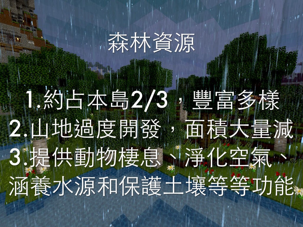 3.提供動物棲息、淨化空氣、涵養水源和保護土壤等等功能