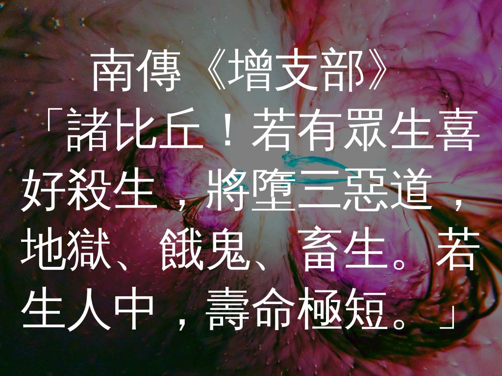 「諸比丘!若有眾生喜好殺生,將墮三惡道,地獄、餓鬼、畜生。若生人中,壽命極短。」