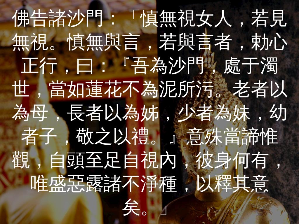 佛告諸沙門:「慎無視女人,若見無視。慎無與言,若與言者,勅心正行,曰:『吾為沙門,處于濁世,當如蓮花不為泥所污。老者以為母,長者以為姊,少者為妹,幼者子,敬之以禮。』意殊當諦惟觀,自頭至足自視內,彼身何有,唯盛惡露諸不淨種,以釋其意矣。」
