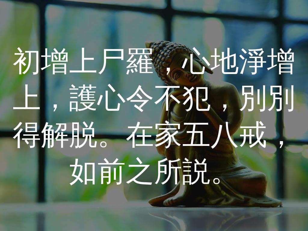 初增上尸羅,心地淨增上,護心令不犯,別別得解脱。在家五八戒,如前之所説。