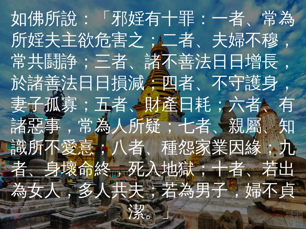 如佛所說:「邪婬有十罪:一者、常為所婬夫主欲危害之;二者、夫婦不穆,常共鬪諍;三者、諸不善法日日增長,於諸善法日日損減;四者、不守護身,妻子孤寡;五者、財產日耗;六者、有諸惡事,常為人所疑;七者、親屬、知識所不愛憙;八者、種怨家業因緣;九者、身壞命終,死入地獄;十者、若出為女人,多人共夫;若為男子,婦不貞潔。」
