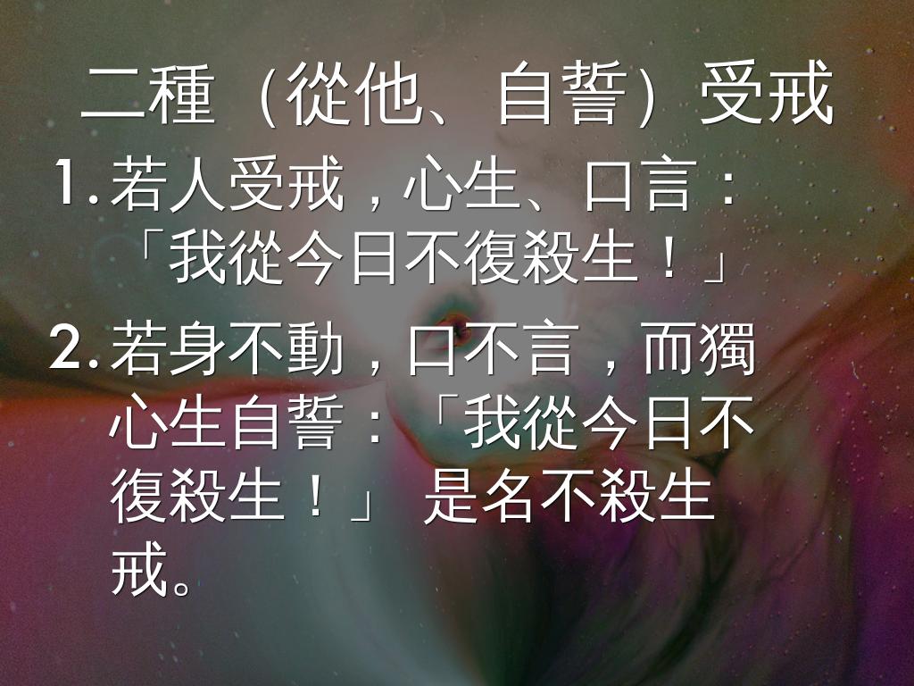 若身不動,口不言,而獨心生自誓:「我從今日不復殺生!」 是名不殺生戒。