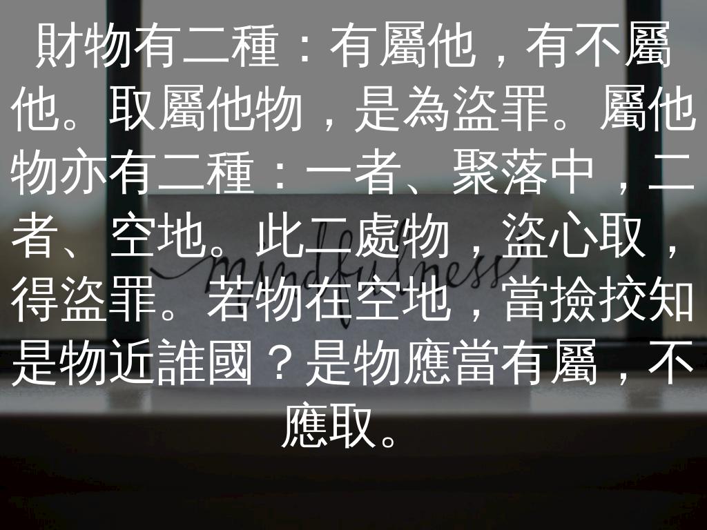 財物有二種:有屬他,有不屬他。取屬他物,是為盜罪。屬他物亦有二種:一者、聚落中,二者、空地。此二處物,盜心取,得盜罪。若物在空地,當撿挍知是物近誰國?是物應當有屬,不應取。