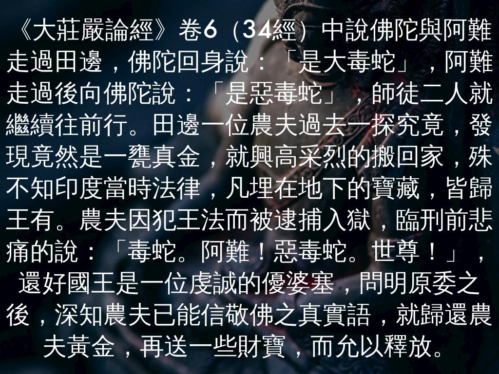 《大莊嚴論經》卷6(34經)中說佛陀與阿難走過田邊,佛陀回身說:「是大毒蛇」,阿難走過後向佛陀說:「是惡毒蛇」,師徒二人就繼續往前行。田邊一位農夫過去一探究竟,發現竟然是一甕真金,就興高采烈的搬回家,殊不知印度當時法律,凡埋在地下的寶藏,皆歸王有。農夫因犯王法而被逮捕入獄,臨刑前悲痛的說:「毒蛇。阿難!惡毒蛇。世尊!」,還好國王是一位虔誠的優婆塞,問明原委之後,深知農夫已能信敬佛之真實語,就歸還農夫黃金,再送一些財寶,而允以釋放。