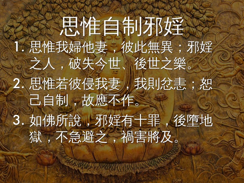 思惟我婦他妻,彼此無異;邪婬之人,破失今世、後世之樂。