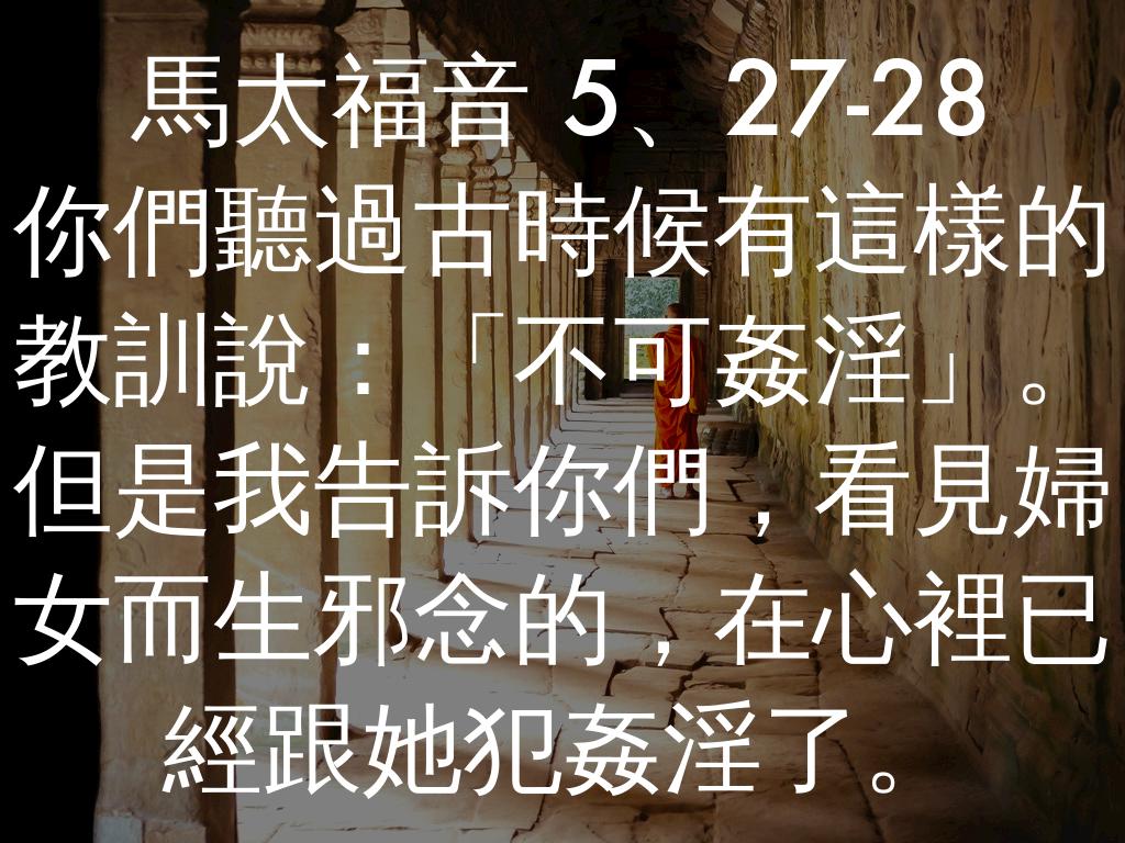 你們聽過古時候有這樣的教訓說:「不可姦淫」。但是我告訴你們,看見婦女而生邪念的,在心裡已經跟她犯姦淫了。