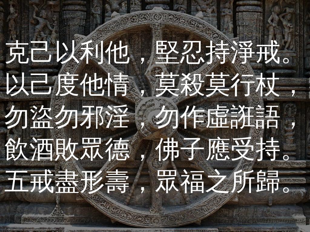 勿盜勿邪淫,勿作虛誑語,飲酒敗眾德,佛子應受持。