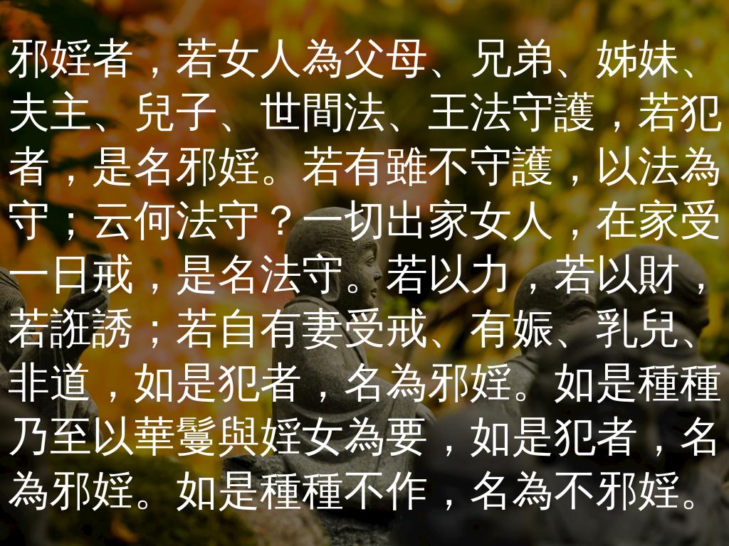 邪婬者,若女人為父母、兄弟、姊妹、夫主、兒子、世間法、王法守護,若犯者,是名邪婬。若有雖不守護,以法為守;云何法守?一切出家女人,在家受一日戒,是名法守。若以力,若以財,若誑誘;若自有妻受戒、有娠、乳兒、非道,如是犯者,名為邪婬。如是種種乃至以華鬘與婬女為要,如是犯者,名為邪婬。如是種種不作,名為不邪婬。