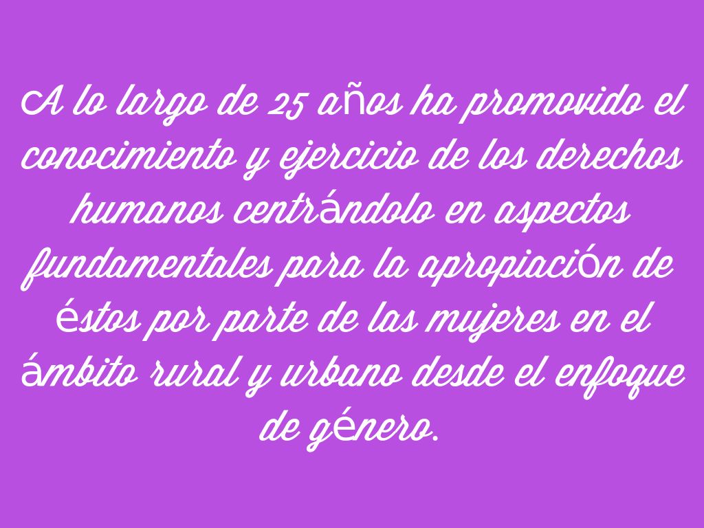 A lo largo de 25 años ha promovido el conocimiento y ejercicio de los derechos humanos centrándolo en aspectos fundamentales para la apropiación de éstos por parte de las mujeres en el ámbito rural y urbano desde el enfoque de género.
