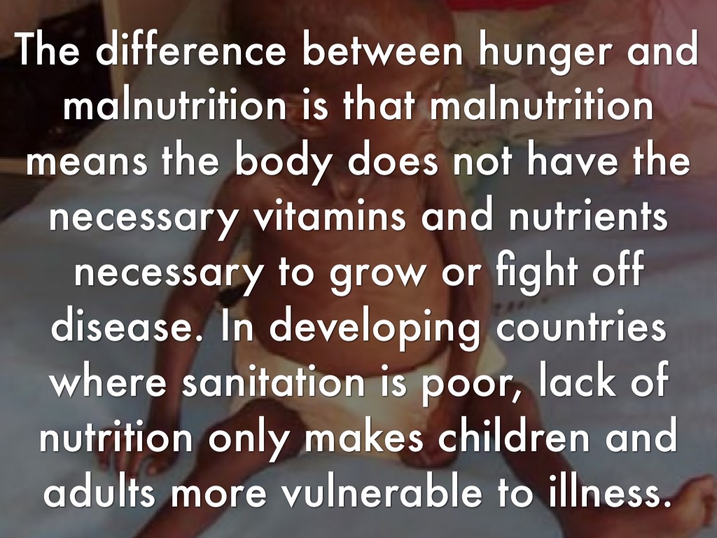 The difference between hunger and malnutrition is that malnutrition means the body does not have the necessary vitamins and nutrients necessary to grow or fight off disease. In developing countries where sanitation is poor, lack of nutrition only makes children and adults more vulnerable to illness.