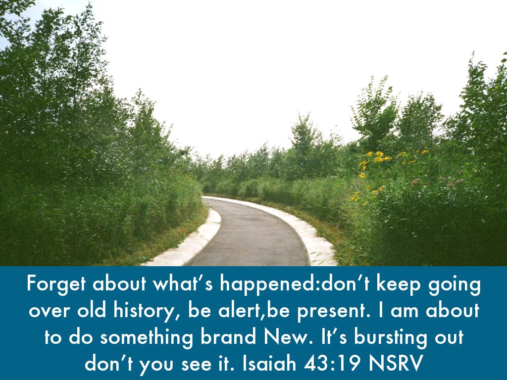 Forget about what’s happened:don’t keep going over old history, be alert,be present. I am about to do something brand New. It’s bursting out. Don’t you see it. Isaiah 43:19 NSRV