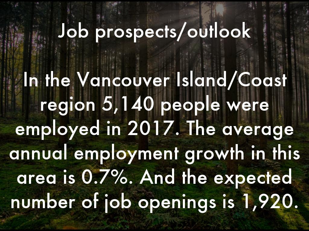In the Vancouver Island/Coast region 5,140 people were employed in 2017. The average annual employment growth in this area is 0.7%. And the expected number of job openings is 1,920.