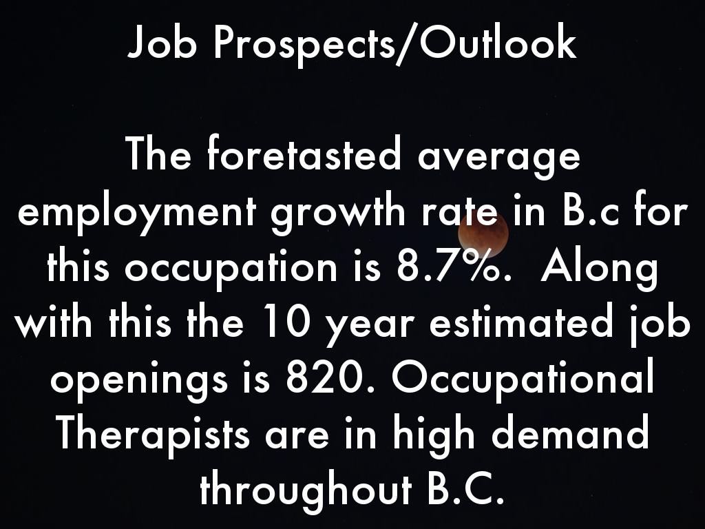 The foretasted average employment growth rate in B.c for this occupation is 8.7%. Along with this the 10 year estimated job openings is 820. Occupational Therapists are in high demand throughout B.C.