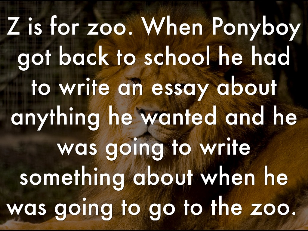 Z is for zoo. When Ponyboy got back to school he had to write an essay about anything he wanted and he was going to write something about when he was going to go to the zoo.