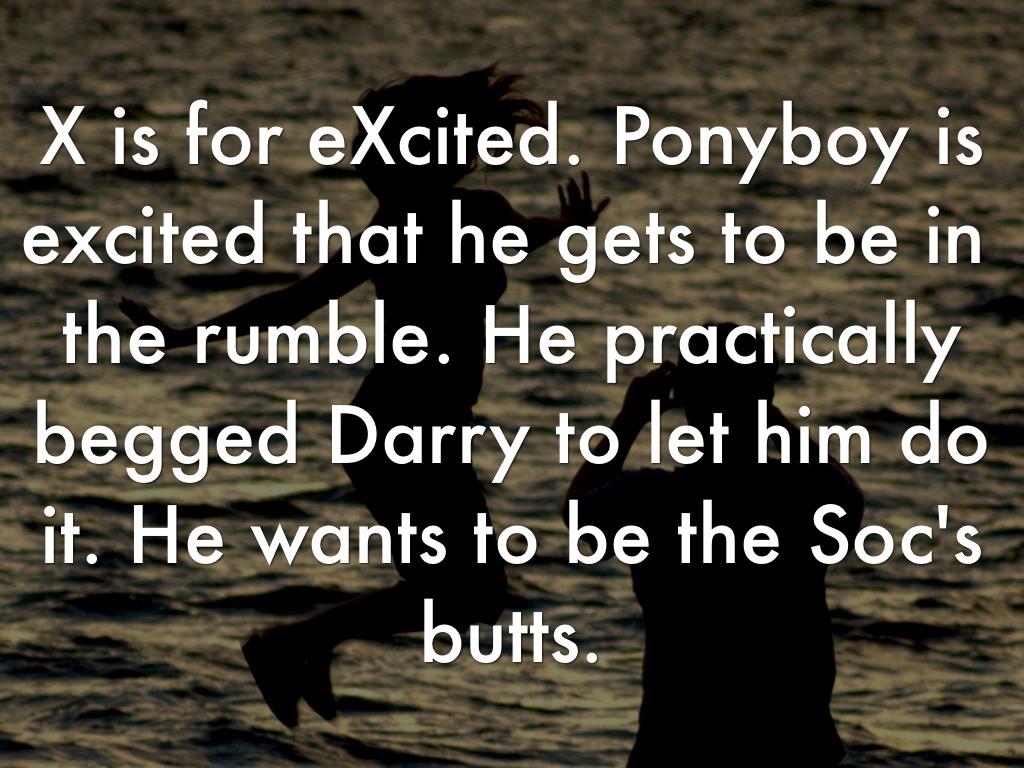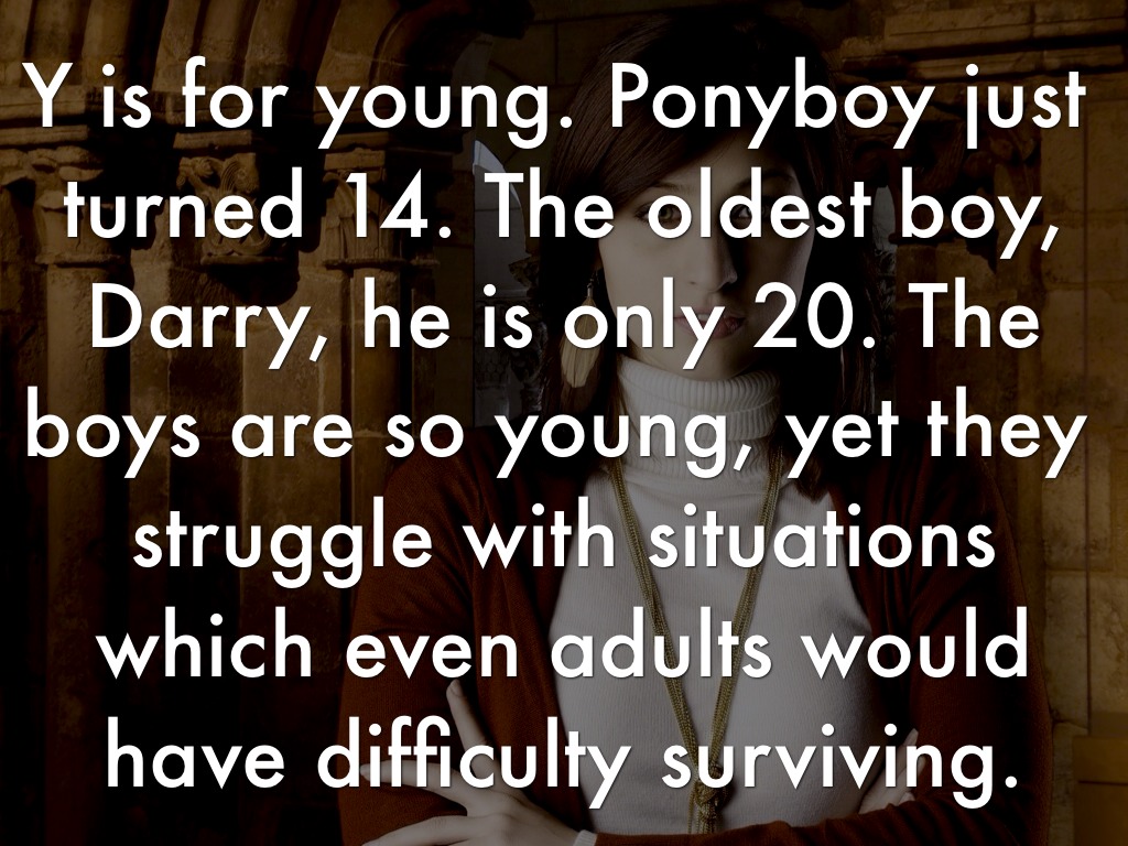 Y is for young. Ponyboy just turned 14. The oldest boy, Darry, he is only 20. The boys are so young, yet they struggle with situations which even adults would have difficulty surviving.