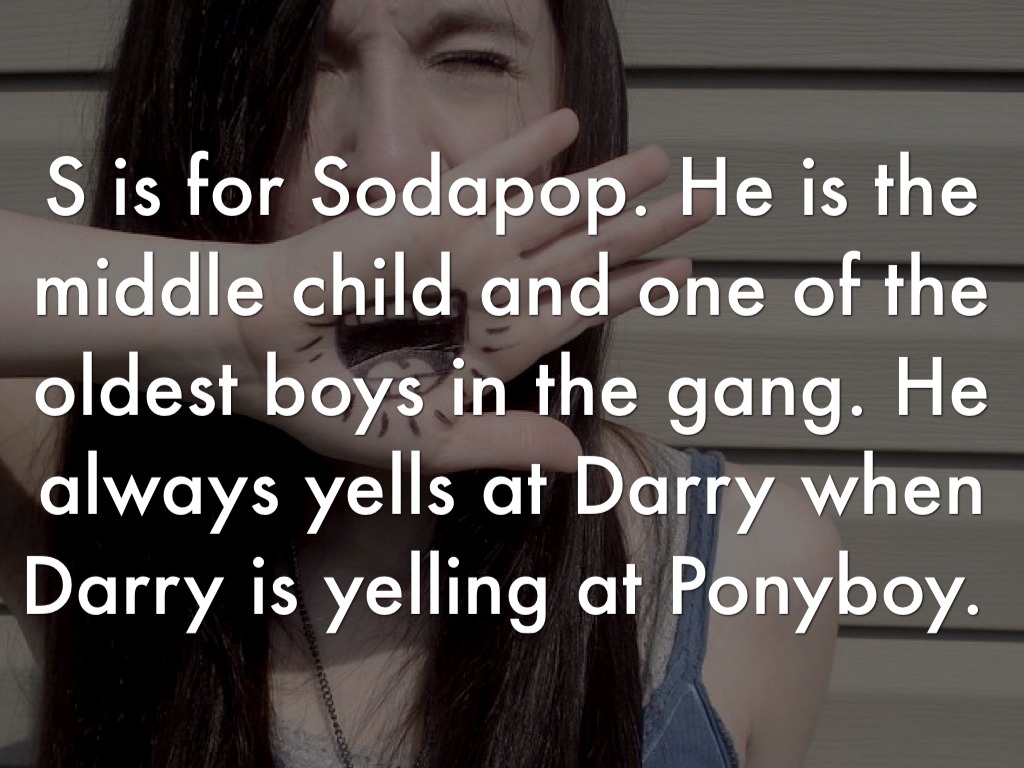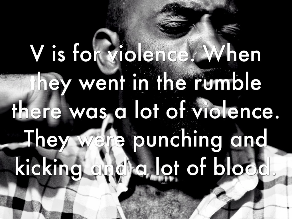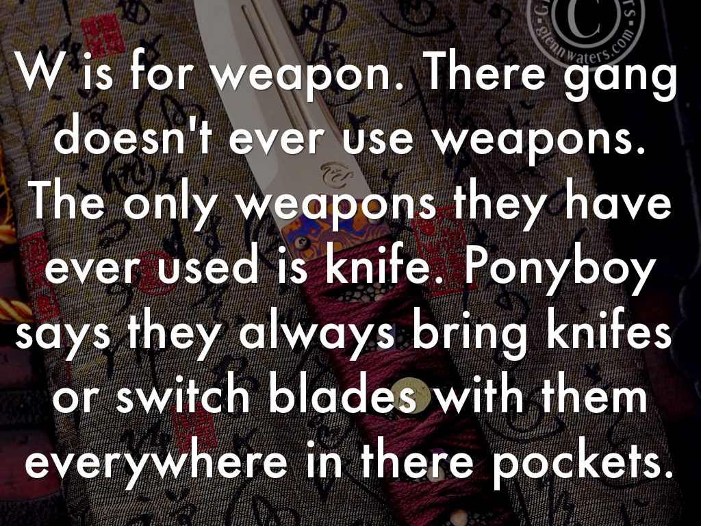 W is for weapon. There gang doesn't ever use weapons. The only weapons they have ever used is knife. Ponyboy says they always bring knifes or switch blades with them everywhere in there pockets.
