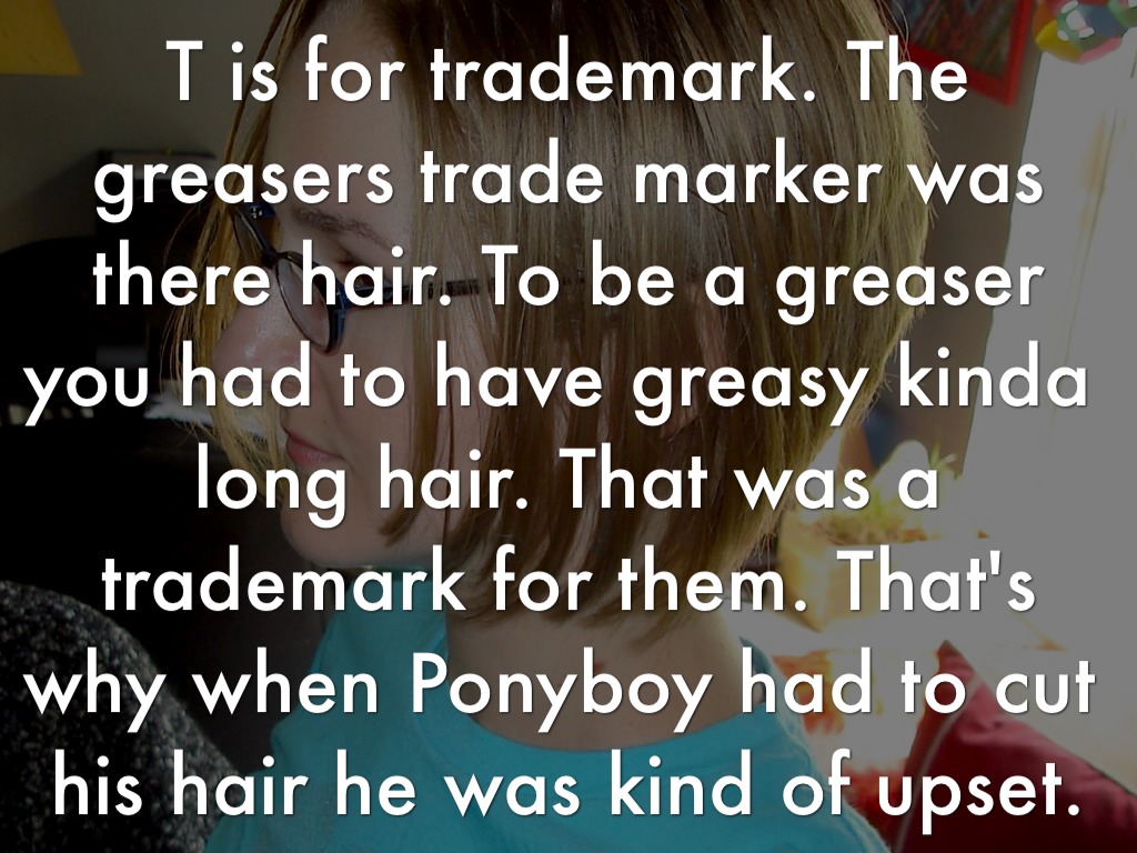 T is for trademark. The greasers trade marker was there hair. To be a greaser you had to have greasy kinda long hair. That was a trademark for them. That's why when Ponyboy had to cut his hair he was kind of upset.