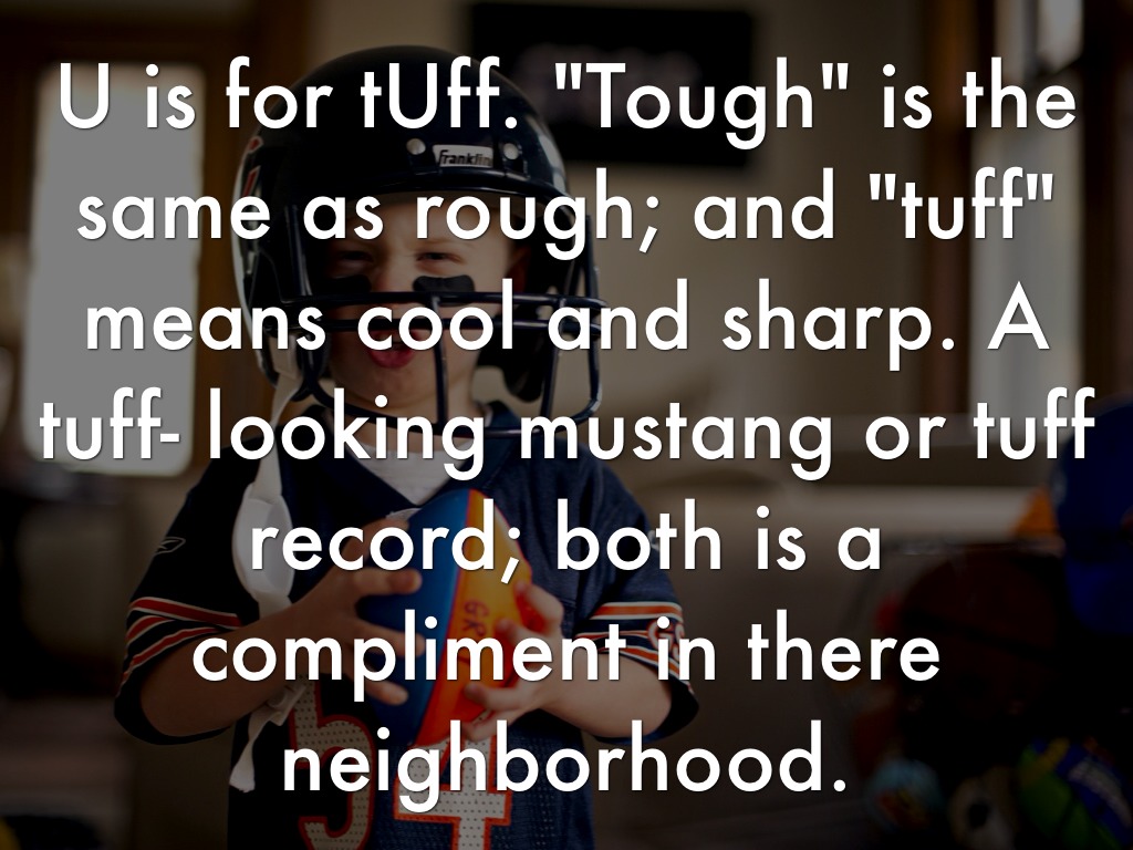 U is for tUff. "Tough" is the same as rough; and "tuff" means cool and sharp. A tuff- looking mustang or tuff record; both is a compliment in there neighborhood.