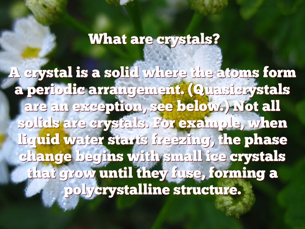 A crystal is a solid where the atoms form a periodic arrangement. (Quasicrystals are an exception, see below.) Not all solids are crystals. For example, when liquid water starts freezing, the phase change begins with small ice crystals that grow until they fuse, forming a polycrystalline structure.