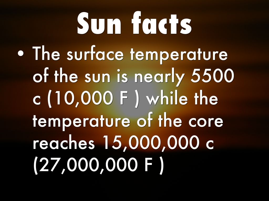 The surface temperature of the sun is nearly 5500 c (10,000 F ) while the temperature of the core reaches 15,000,000 c (27,000,000 F )